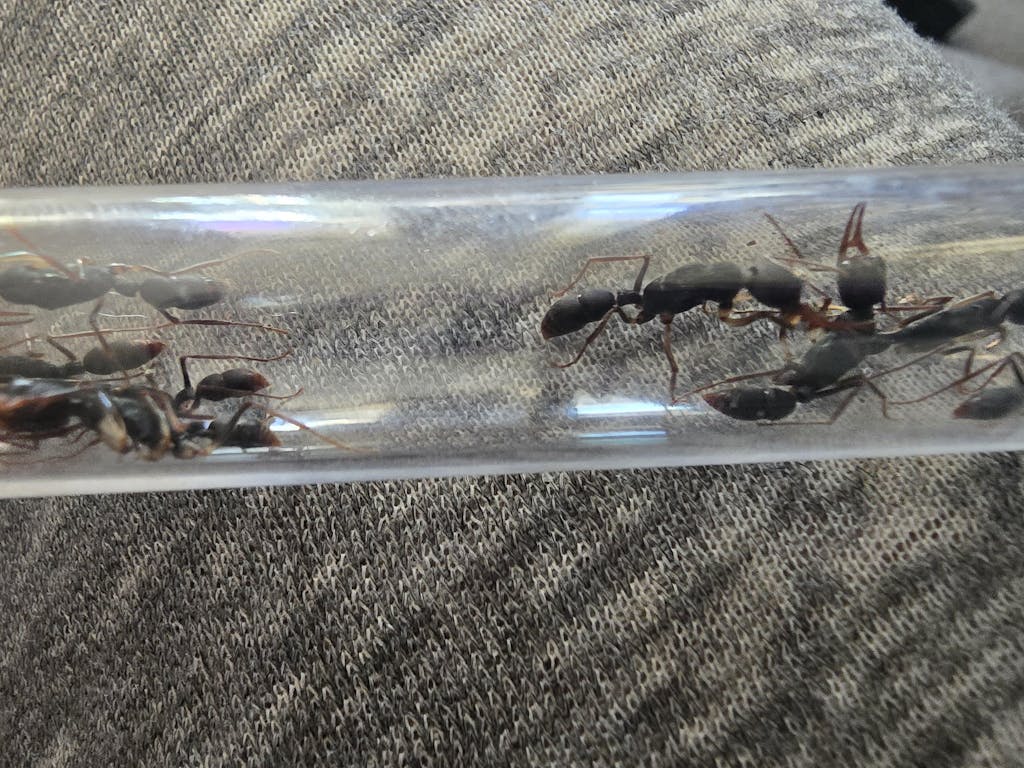 Sehr schön gezeichnete asiatische Oecophylla smaragdina-Königin mit 6 Arbeiterinnen, eine hatte den Transport leider nich lebend überstanden. Bei so einer empfindlichen Art kann das passieren. Die kleine Kolonie hat sich inzwischen gut eingelebt.