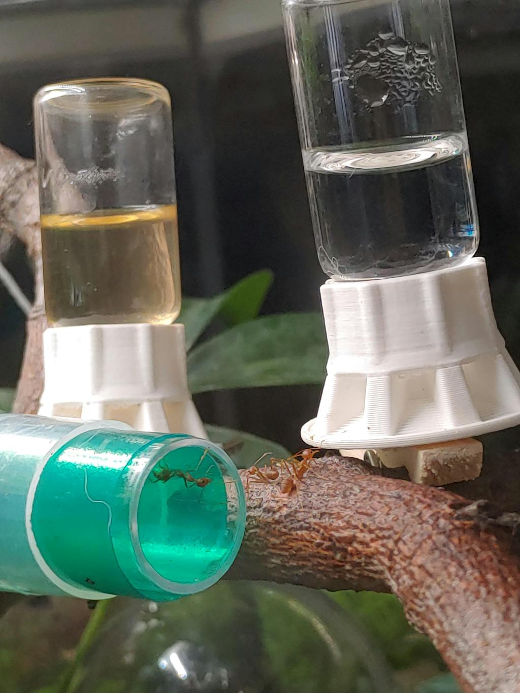 Gute Druckqualität des Sockels, da läuft nichts aus aber die Ameisen können doch gut Wasser aufnehmen. Die 5ml-Tränke ist genau richtig, für die noch sehr kleine Oecophylla smaragdina Kolonie.