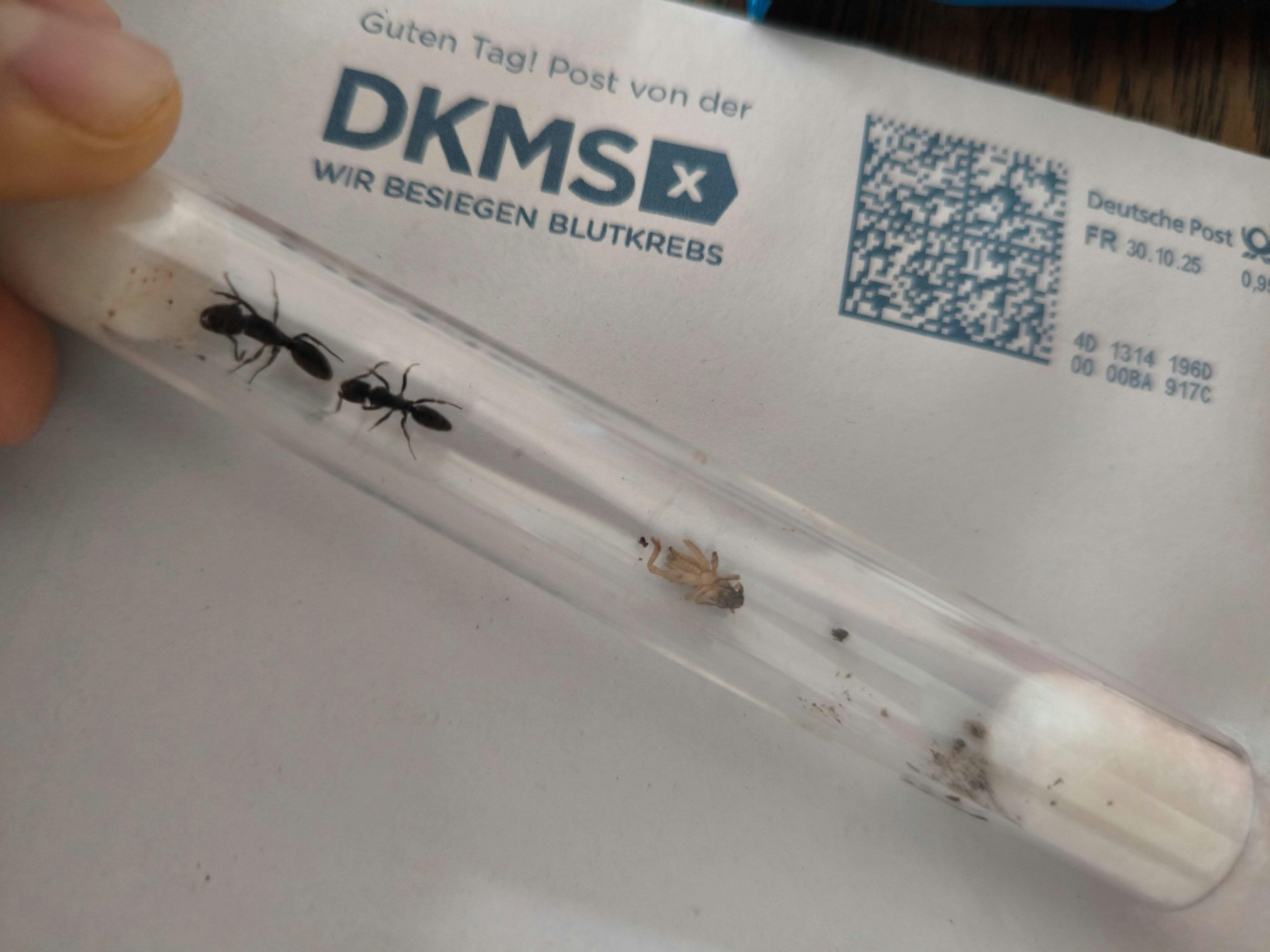 Positiv war, dass obwohl ich nur eine Queen mit brut gekauft habe eine Arbeiterin mit dazu geschickt wurde. Dieser geht es gut und sie erkundet weiterhin das Reagenzglas.